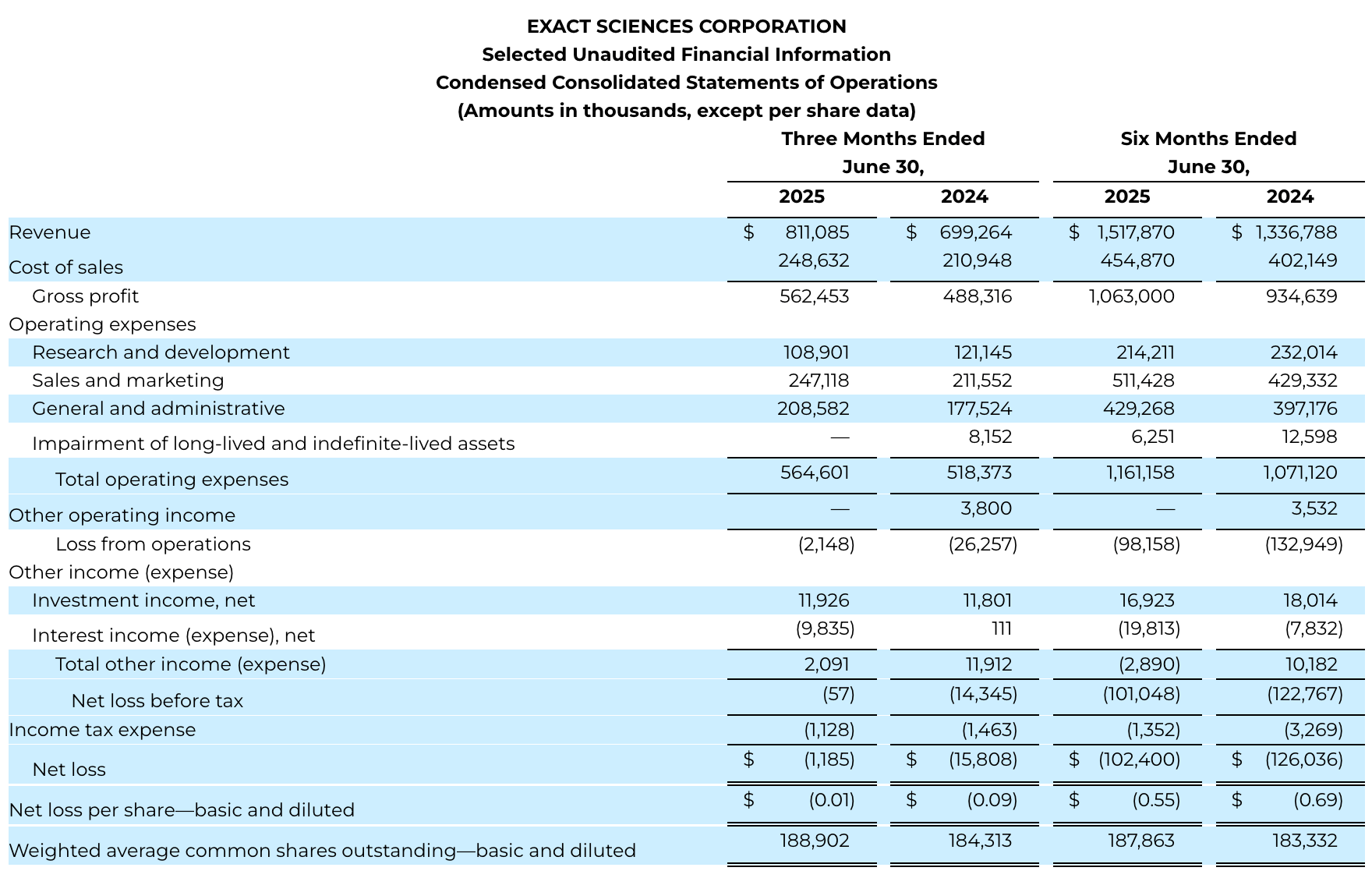 MADISON, Wis., August 6, 2025 -- Exact Sciences Corp. (Nasdaq: EXAS), a leading provider of cancer screening and diagnostic tests, today announced that the Company generated revenue of $811 million for the second quarter ended June 30, 2025, compared to $699 million for the same period of 2024.