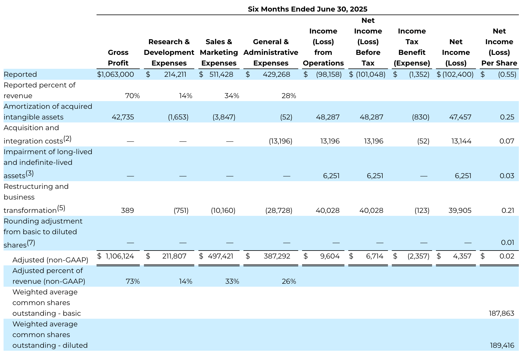 Management believes that presentation of non-GAAP financial measures provides supplemental information useful to investors in understanding our underlying operating results and trends. Non-GAAP financial information, when taken collectively, may be helpful to investors because it provides consistency and comparability of the Company's operating results across reporting periods. Management uses this non-GAAP financial information to establish budgets, manage the Company's business, and set incentive and compensation arrangements. Free cash flow provides useful information to management and investors since it measures our ability to generate cash from business operations. Non-GAAP financial information is presented for supplemental information purposes only, has limitations as an analytical tool and should not be considered in isolation or as a substitute for financial information presented in accordance with U.S. GAAP. For example, adjusted gross margin and adjusted gross profit exclude the amortization of acquired intangible assets although such measures include the revenue associated with the acquisitions. Additionally, adjusted EBITDA and other adjusted operating result metrics exclude a number of expense items that are included in net loss. As a result, positive adjusted EBITDA, adjusted operating income, or adjusted earnings per share may be achieved while a significant net loss persists. For more information on these non-GAAP financial measures, see the tables captioned “U.S. GAAP to Non-GAAP Reconciliation.” The Company presents certain forward-looking statements about the Company's future financial performance that include non-GAAP measures. These non-GAAP measures include adjustments like stock-based compensation, acquisition and integration costs including gains and losses on contingent consideration, and other significant charges or gains that are difficult to predict for future periods because the nature of the adjustments pertain to events that have not yet occurred. Additionally, management does not forecast many of the excluded items for internal use. Information reconciling forward-looking non-GAAP measures to U.S. GAAP measures is therefore not available without unreasonable effort and is not provided. The occurrence, timing, and amount of any of the items excluded from GAAP to calculate non-GAAP could significantly impact the Company's GAAP results.