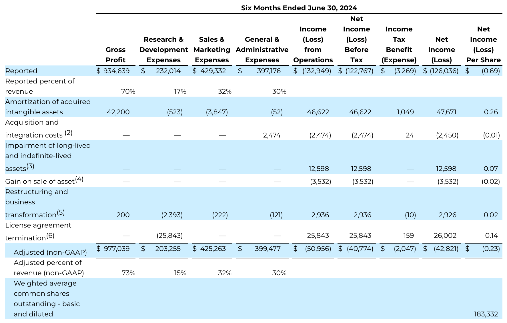 Adjusted gross profit, adjusted research and development expenses, adjusted sales and marketing expenses, adjusted general and administrative expenses, adjusted income (loss) from operations, adjusted net income (loss) before tax, adjusted income tax expense (benefit), adjusted net income (loss), and adjusted earnings per share — The Company refers to various “adjusted” amounts or measures on an “adjusted” basis, which exclude the impact of amortization of intangible assets and certain charges or benefits resulting from transactions or events that are highly variable, significant in size, and that we do not believe are indicative of ongoing or future business operations. These items are described in more detail below in the tables captioned “U.S. GAAP to Non-GAAP Reconciliation”. The Company also presents certain of these adjusted measures as a percentage of revenue including adjusted gross margin.